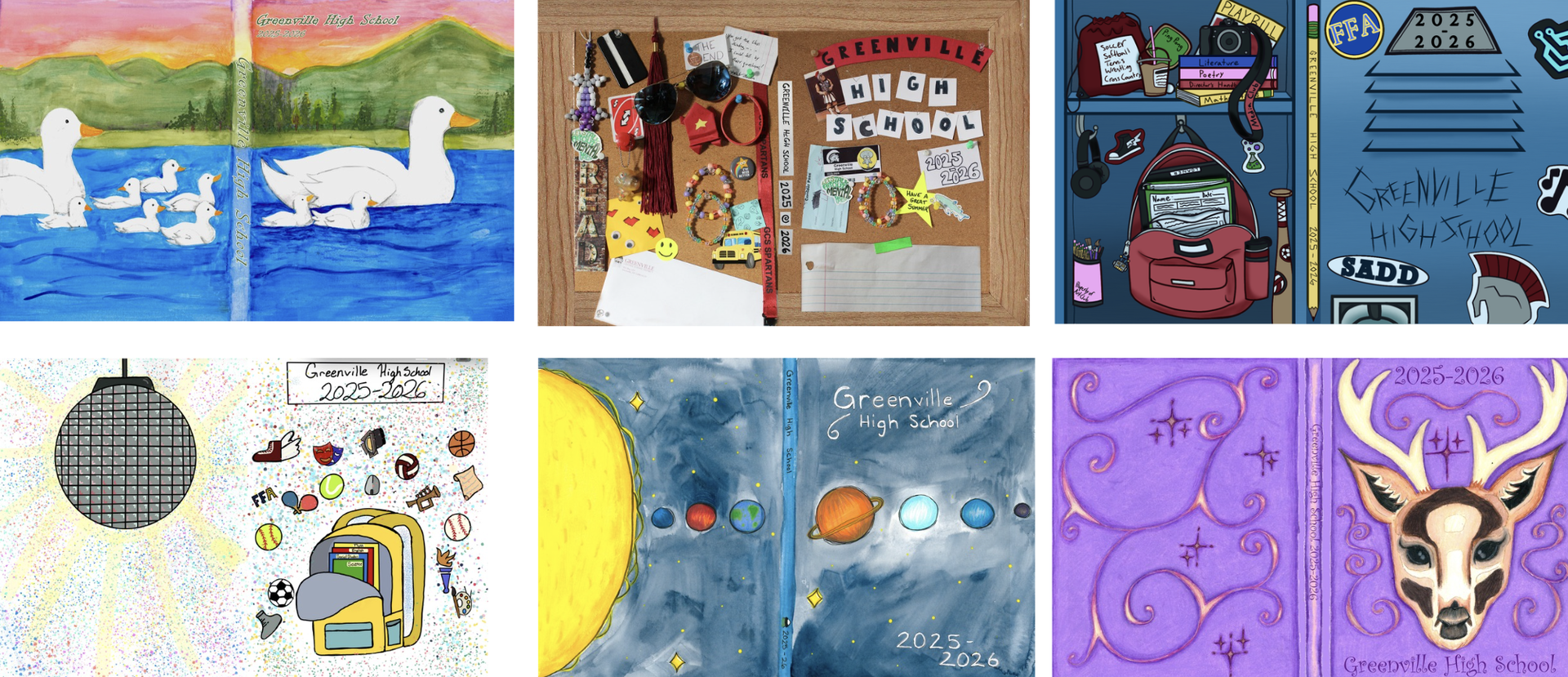 The two classes were given the open-ended challenge of creating a design that could be used as the 2025-2026 Greenville High School yearbook cover. We looked at covers that had been selected in the past by the student body and why they may have been selected. We talked about the use of imagery, colors, and fonts. We also went over graphic design terms like bleed lines, layers, and templates.